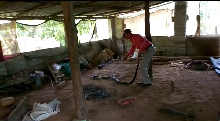 ಹುಲುಮಕ್ಕಿಯ ಸುರೇಶ್ ಸೋಮವಾರ ಸಂಜೆ ಕೊಟ್ಟಿಗೆಯಲ್ಲಿದ್ದ ಹಸುವನ್ನ ಹೊರಗಡೆ ಕಟ್ಟಲು ಹೋದಾಗ ಬೃಹತ್ ಕಾಳಿಂಗನನ್ನ ಕಂಡು ಹೆದರಿ ಹೊರ ಓಡಿ ಬಂದಿದ್ದಾರೆ.