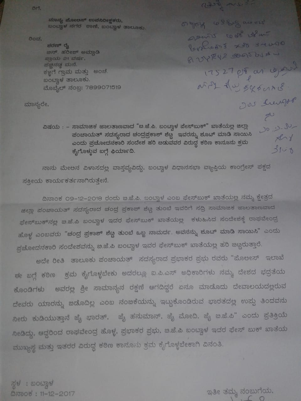 ಅವರ ವಿರುದ್ಧವೂ ಹಾಗೂ ಬಿಜೆಪಿ ಪೇಸ್ಬುಕ್ ಪೇಜ್ನ ಮುಖ್ಯಸ್ಥರ ಮೇಲೆ ಕಠಿಣ ಕಾನೂನು ಕ್ರಮಕೈಗೊಳ್ಳಲು ಎಂದು ದೂರಿನಲ್ಲಿ ತಿಳಿಸಿದ್ದಾರೆ.