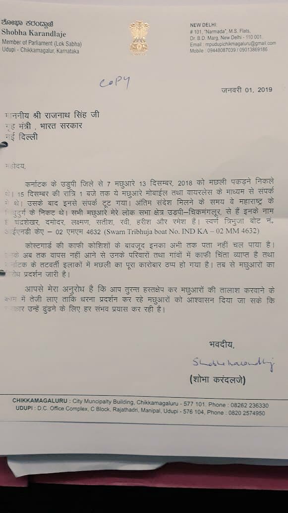 ಡಿ.13 ರಂದು ಮಲ್ಪೆ ಬಂದರಿನಿಂದ ತೆರಳಿದ್ದ 8 ಮಂದಿಯ ತಂಡ ನಾಪತ್ತೆಯಾದ ‘ಸುವರ್ಣ ತ್ರಿಭುಜ’ ಬೋಟ್ನ ತ್ವರಿತ ಪತ್ತೆ ಕಾರ್ಯಕ್ಕಾಗಿ ಶೋಭಾ ಕರಂದ್ಲಾಜೆ ಕೇಂದ್ರ ಗೃಹ ಸಚಿವ ರಾಮ್ನಾಥ್ ಸಿಂಗ್ಗೆ ಮನವಿ ಸಲ್ಲಿಸಿದ್ದಾರೆ.