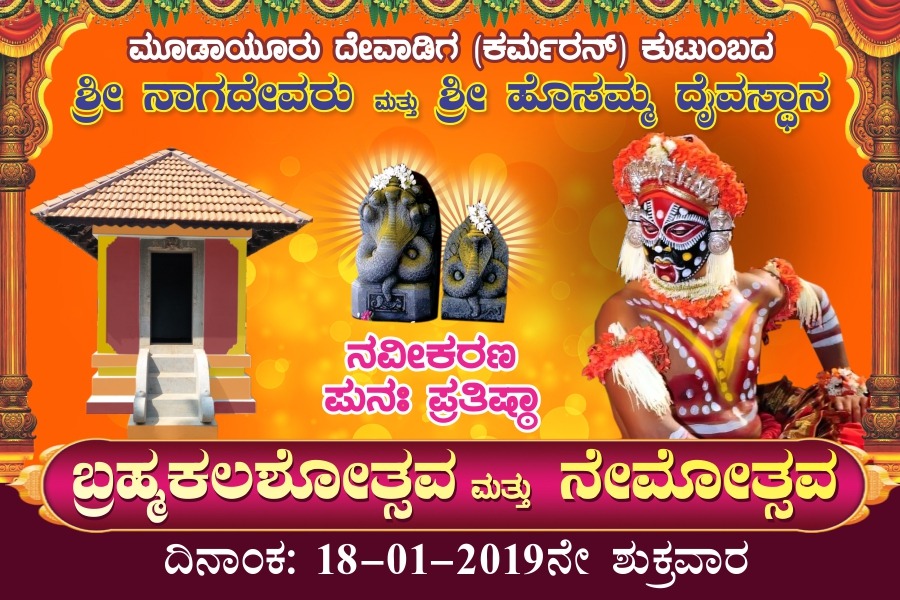 ಪುತ್ತೂರು: ತಾಲೂಕಿನ ಚಿಕ್ಕಮಡ್ನೂರಿನ ಮೂಡಾಯೂರು ದೇವಾಡಿಗ (ಕರ್ಮರನ್) ಕುಟುಂಬದ ಶ್ರೀ ನಾಗದೇವರು ಮತ್ತು ಶ್ರೀ ಹೊಸಮ್ಮ ದೈವಸ್ಥಾನದಲ್ಲಿ ನವೀಕರಣ ಪುನಃ ಪ್ರತಿಷ್ಠಾ ಬ್ರಹ್ಮಕಲಶೋತ್ಸವ ಮತ್ತು ನೇಮೋತ್ಸವವು ಜನವರಿ 18 ರಂದು ನಡೆಯಲಿದೆ.