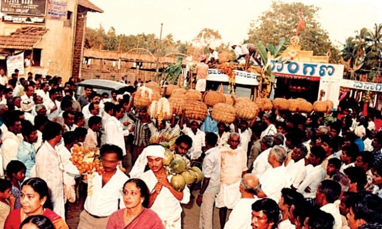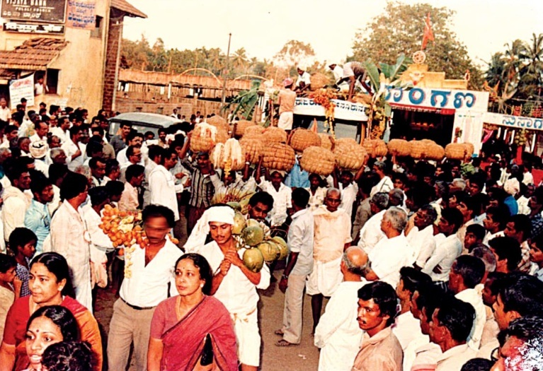 ಬ್ರಹ್ಮಕಲಶೋತ್ಸವದಲ್ಲಿ ಭಾಗಿಯಾಗಿ ಹೊರಕಾಣಿಕೆ ಹೊತ್ತೋಯ್ಯುತ್ತಿರುವ ಬಲು ಅಪರೂಪದ ಚಿತ್ರ ಇದಾಗಿದೆ.