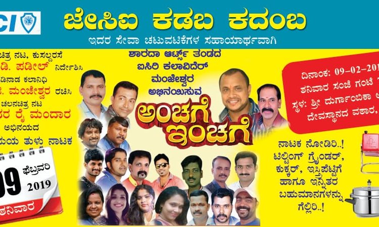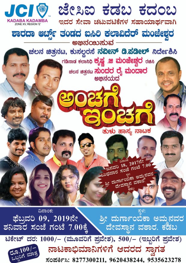 ಕಡಬ: ಜೆಸಿಐ ಕಡಬ ಕದಂಬ ಇದರ ಸಹಾಯಾರ್ಥವಾಗಿ ನಾಳೆ ಕಡಬದ ಶ್ರೀ ದುಗಾರ್ಂಬಿಕ ಅಮ್ಮನವರ ದೇವಸ್ಥಾನದ ವಠಾರದಲ್ಲಿ ಅಂಚಗೆ ಇಂಚಗೆ ತುಳು ನಾಟಕ ಪ್ರದರ್ಶನಗೊಳ್ಳಲಿದೆ ಎಂದು ಜೇಸಿಐ ಕಡಬ ಕದಂಬದ ಪದಾಧಿಕಾರಿಗಳು ತಿಳಿಸಿದ್ದಾರೆ.