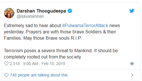 ಭಯೋತ್ಪಾದನೆ ಯಾವತ್ತು ಮಾನವ ಕುಲಕ್ಕೆ ಅಪಾಯಕಾರಿ, ಅದನ್ನು ಸಮಾಜದಿಂದ ಬುಡ ಸಹಿತ ಕಿತ್ತು ಹಾಕಬೇಕು.” ಎಂದು ನಟ ದರ್ಶನ್ ಟ್ವೀಟ್ ಮಾಡಿದ್ದಾರೆ.