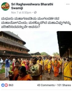 ಗಮನಿಸಬೇಕಾದ ಅಂಶ : ಮಧೂರು ದೇವಸ್ಥಾನಕ್ಕೆ ಬೇಟಿನೀಡಿದ ಶ್ರೀಗಳು ತಮ್ಮ ಅಧಿಕೃತ ಫೇಸ್ ಬುಕ್ ಖಾತೆಯಲ್ಲಿ ” ಮಧೂರು ಮಹಾಗಣಪತಿಯ ಮಂಗಲದರ್ಶನದ ಮಹಾಯೋಗವಿಂದು; ಮಠಕ್ಕೊದಗಿದ ಮಹಾವಿಘ್ನಗಳನ್ನು ಪರಿಹರಿಸಿದವನಲ್ಲವೇ ಅವನು!? ” ನವೆಂಬರ್ ಏಳರಂದು ರಾತ್ರಿ ಎಂಟು ಐವತ್ತರ ಸಮಯಕ್ಕೆ ಫೋಟೋ ಸಹಿತ ಪೋಷ್ಟ್ ಮಾಡಿರುವುದು ಕಂಡುಬಂದಿದೆ. ಹಾಗೆಯೇ ರಾಮಚಂದ್ರಾಪುರಾ ಮಠದ ಮೇಲಿನ ಸಾಲು ಸಾಲು ಸುಳ್ಳು ಕೇಸುಗಳ ಮತ್ತು ಶ್ರೀಗಳ ಮೇಲೆ ನಡೆದ ವ್ಯವಸ್ಥಿತ ಶಡ್ಯಂತ್ರದಿಂದ ಮಠವನ್ನು ಮತ್ತು ಶ್ರೀಗಳನ್ನು ರಕ್ಷಿಸಿದ್ದು ಈ ಮೂರು ಶಕ್ತಿದೇವತೆಗಳೇ ಎಂಬ ಪ್ರಶ್ನೆ ಈಗ ಮೂಡುತ್ತಿದೆ. ಆ ಎಲ್ಲಾ ದೇವತೆಗಳಿಗೂ ಧನ್ಯವಾದ ಸಲ್ಲಿಸಲು ಶ್ರೀಗಳ ಕ್ಷೇತ್ರಗಳಿಗೆ ಸಂದರ್ಶಿಸಿದ್ದಾರೆಯೇ ? ಎಂಬ ಪ್ರಶ್ನೆಯೂ ಹುಟ್ಟಿಕೊಂಡಿದೆ. ಒಟ್ಟಾರೆ ಶ್ರೀಗಳ ದಕ್ಷಿಣ ಕನ್ನಡ ಭೇಟಿ ಯಶಸ್ಸಿಗಾಗಿ ಪೂರ್ಣಗೊಳ್ಳಲಿದೆ.