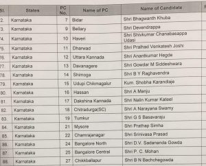 ನವದೆಹಲಿ: ಮತ್ತೆ ಅಧಿಕಾರದ ಗದ್ದುಗೆ ಏರಲು ಪ್ರಯತ್ನಿಸುತ್ತಿರುವ ಬಿಜೆಪಿ 184 ಅಭ್ಯರ್ಥಿಗಳ ಪಟ್ಟಿಯನ್ನು ಬಿಡುಗಡೆಗೊಳಿಸಿದೆ. ಕರ್ನಾಟಕದ ಹಾಲಿ ಬಹುತೇಕ ಸಂಸದರಿಗೆ ಟಿಕೆಟ್ ನೀಡಲಾಗಿದ್ದು 20 ಕ್ಷೇತ್ರಗಳ ಅಭ್ಯರ್ಥಿಗಳನ್ನು ಫೈನಲ್ ಮಾಡಿದೆ.