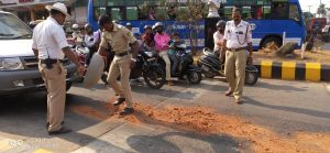 ಮಂಗಳೂರು: ಲಾರಿಯಲ್ಲಿ ಎಣ್ಣೆ ಸಾಗಾಟ ಮಾಡುತ್ತಿದ್ದ ವೇಳೆ, ಎಣ್ಣೆ ರಸ್ತೆಯಲ್ಲಿ ಚೆಲ್ಲಿ ಬೈಕ್ ಸವಾರರೊನೊಬ್ಬ ಬಿದ್ದು ಗಾಯಗೊಂಡಿದ್ದ. ಇದನ್ನು ಕಂಡು ಪೊಲೀಸರು ಎಣ್ಣೆ ಚೆಲ್ಲಿದ ಕಡೆಗಳಿಗೆ ಮಣ್ಣು ಹಾಕಿ ಎಣ್ಣೆ ಬಿದ್ದ ಸ್ಥಳವನ್ನು ಮುಚ್ಚಿ ಸಮಯಪ್ರಜ್ಞೆ ಮೆರೆದ ಘಟನೆ ನಗರದ ಲಾಲ್ಬಾಗ್ ಸಮೀಪ ನಡೆದಿದೆ.