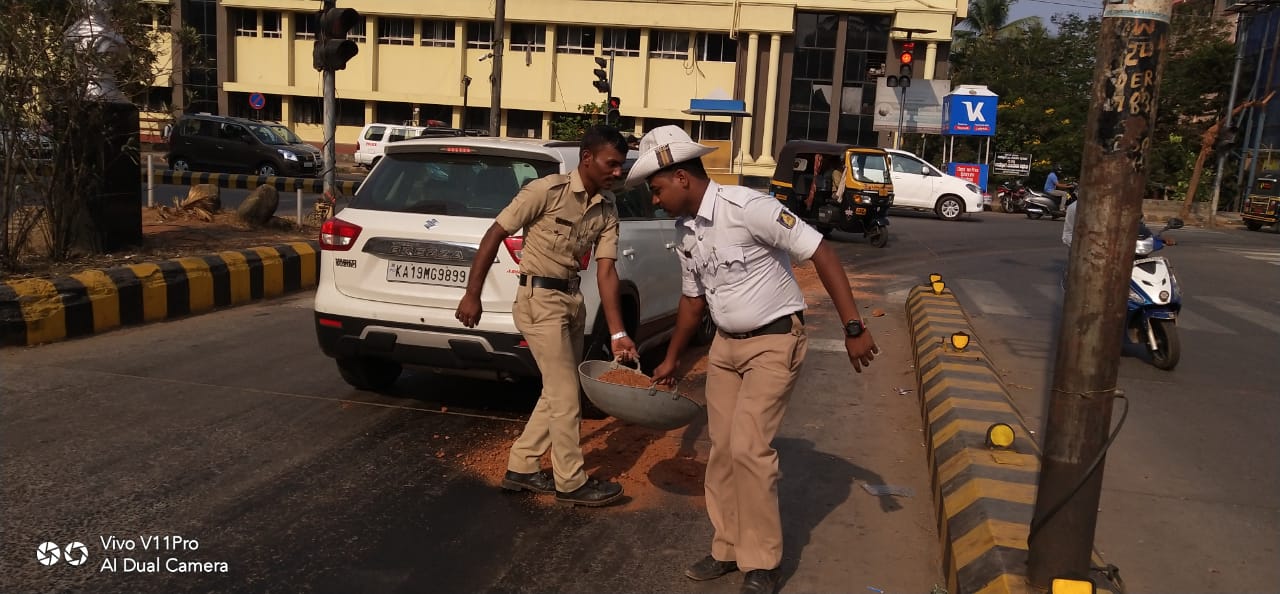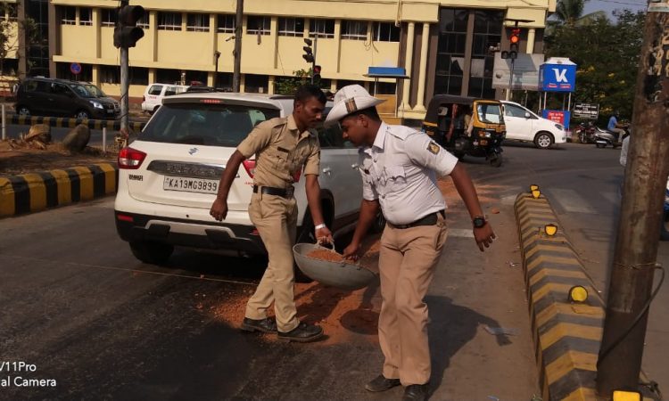 ಲಾಲ್ಬಾಗ್ ಜಂಕ್ಷನ್ನಲ್ಲಿ ಎಣ್ಣೆ ಬಿದ್ದಿರುವುದರ ಬಗ್ಗೆ ಟ್ರಾಫಿಕ್ ಪೊಲೀಸ್ ಮಂಗಳೂರು ಮಹಾನಗರ ಪಾಲಿಕೆಗೆ ದೂರು ನೀಡಲಾಗಿತ್ತು. ಆದರೆ ಯಾವುದೇ ಪ್ರತಿಕ್ರಿಯೆ ಬರದಿರುವುದನ್ನು ಕಂಡು ಟ್ರಾಫಿಕ್ ಪೊಲೀಸರಾದ ಶ್ರೀಕಾಂತ್, ಬಂದೇ ನವಾಜ್ ಹಾಗೂ ಎಎಸ್ಐ ಸುರೇಶ್ ತಾವೇ ಮಣ್ಣು ಹಾಕಿ ಎಣ್ಣೆ ಬಿದ್ದಿರುವ ಜಾಗವನ್ನು ಮುಚ್ಚಿ ಸಾರ್ವಜನಿಕರಿಂದ ಪ್ರಶಂಸೆಗೆ ಪಾತ್ರರಾಗಿದ್ದಾರೆ.