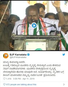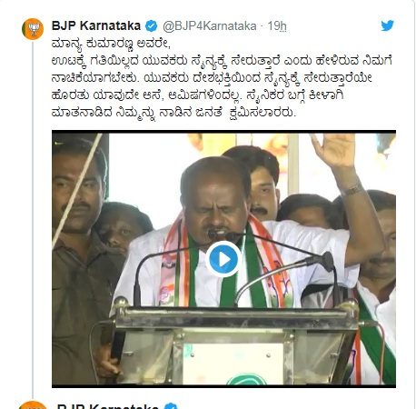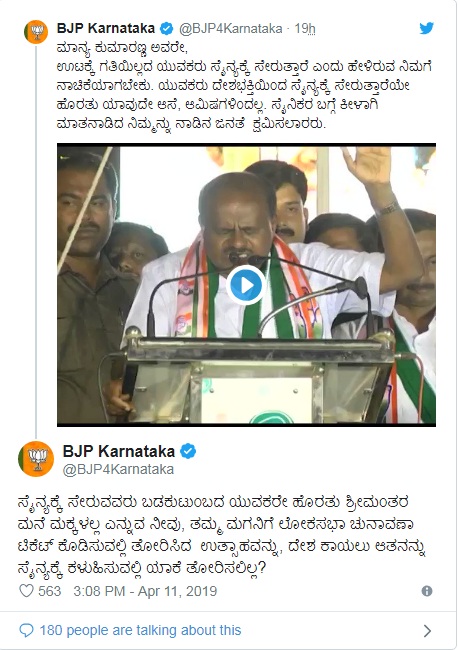 ಸಿಎಂ ಕುಮಾಸ್ವಾಮಿ ವಿರುದ್ದ ತೀವ್ರ ಟೀಕಾ ಪ್ರಹಾರ ಪ್ರಾರಂಭವಾಗಿದ್ದು, ತಮ್ಮ ಮಗನಿಗೆ ಲೋಕಸಭಾ ಚುನಾವಣಾ ಟಿಕೆಟ್ ಕೊಡಿಸುವಲ್ಲಿ ತೋರಿಸಿದ ಉತ್ಸಾಹವನ್ನು, ದೇಶ ಕಾಯಲು ಆತನನ್ನು ಸೈನ್ಯಕ್ಕೆ ಕಳುಹಿಸುವಲ್ಲಿ ಯಾಕೆ ತೋರಿಸಲಿಲ್ಲ’ ಎಂದು ಬಿಜೆಪಿ ಕರ್ನಾಟಕ ಟ್ವೀಟ್ ಮಾಡಿದೆ.