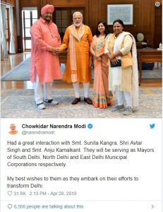 ನೂತನವಾಗಿ ಆಯ್ಕೆಯಾದ ದಕ್ಷಿಣ ದೆಹಲಿ, ಉತ್ತರ ದೆಹಲಿ ಮತ್ತು ಪೂರ್ವ ದೆಹಲಿ ಮಹಾನಗರ ಪಾಲಿಕೆಯ ಮೇಯರ್ಗಳು ತಮ್ಮನ್ನು ಭೇಟಿಯಾದ ವೇಳೆ ಪ್ರಧಾನಿ ನರೇಂದ್ರ ಮೋದಿ ಶುಭ ಕೋರಿದರು.