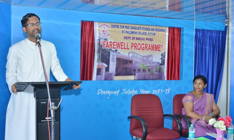 ಸಮಾಜಕಾರ್ಯ ವಿಭಾಗದ ಸಂಯೋಜಕಿ ಶ್ರೀಮಣಿ ಮಾತನಾಡಿ, ಉನ್ನತ ಇತಿಹಾಸವಿರುವ ಈ ಸಂಸ್ಥೆಯಲ್ಲಿ ಅಧ್ಯಯನಗೈದ ವಿದ್ಯಾರ್ಥಿಗಳು ಸಮಾಜದ ವಿವಿಧ ಸ್ತರಗಳಲ್ಲಿ ಜವಾಬ್ದಾರಿಯನ್ನು ನಿಭಾಯಿಸುತ್ತಿದ್ದಾರೆ. ಪ್ರಸ್ತುತ ಎರಡು ವರ್ಷಗಳ ಅಧ್ಯಯನವನ್ನು ಪೂರೈಸಿ, ನಿರ್ಗಮನದ ಅಂಚಿನಲ್ಲಿರುವ ವಿದ್ಯಾರ್ಥಿಗಳು ಸಮಾಜಮುಖಿ ಚಟುವಟಿಕೆಗಳಲ್ಲಿ ಸಕ್ರಿಯವಾಗಿ ಭಾಗವಹಿಸಲು ಸದವಕಾಶ ಒದಗಿ ಬರಲಿ ಎಂದು ಹಾರೈಸಿದರು. ಅಂತಿಮ ವರ್ಷದ ವಿದ್ಯಾರ್ಥಿಗಳ ವತಿಯಿಂದ ಸುಹಾಗ್, ಮಹೇಶ್ ಮತ್ತು ವಿಜಯಲಕ್ಷ್ಮೀ ಎರಡು ವರ್ಷಗಳ ಸ್ನಾತಕೋತ್ತರ ವಿದ್ಯಾರ್ಥಿ ಜೀವನದಲ್ಲಿ ತಮಗಾದ ಶೈಕ್ಷಣಿಕ ಅನುಭವವನ್ನು ಹಂಚಿಕೊಂಡು ಕೃತಜ್ಞತೆ ಸಲ್ಲಿಸಿದರು.
