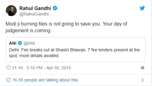 ದೆಹಲಿಯ ಶಾಸ್ತ್ರಿ ಭವನದಲ್ಲಿ ನಡೆದ ಬೆಂಕಿ ಅನಾಹುತದ ಬಗ್ಗೆ ಟ್ವೀಟ್ ಮಾಡಿರುವ ರಾಹುಲ್, ಮೋದಿಜೀ ಕಡತಗಳನ್ನು ವ್ಯವಸ್ಥಿತವಾಗಿ ಸುಟ್ಟು ಹಾಕುವುದರಿಂದ, ನಿಮ್ಮ ಸರಕಾರದ ಅಕ್ರಮಗಳು ಬಯಲಿಗೆ ಬರುವುದಿಲ್ಲ ಎಂದುಕೊಳ್ಳಬೇಡಿ. ಅಧಿಕಾರದಿಂದ ಇಳಿಯುವ ದಿನಗಳು ಹತ್ತಿರ ಬರುತ್ತಿವೆ ಎಂದು ರಾಹುಲ್ ಬರೆದುಕೊಂಡಿದ್ದಾರೆ.