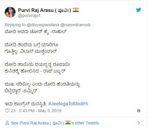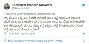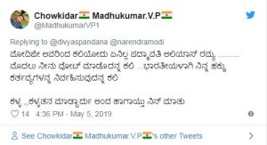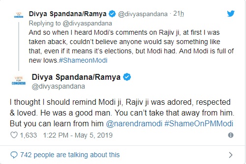 ಚುನಾವಣಾ ಪ್ರಚಾರದ ವೇಳೆ ಪ್ರಧಾನಿ ನರೇಂದ್ರ ಮೋದಿ ರಾಹುಲ್ ಗಾಂಧಿ ಅವರ ಮೇಲೆ ವಾಗ್ದಾಳಿ ಮಾಡುತ್ತ ಮಾಜಿ ಪ್ರಧಾನಿ ರಾಜೀವ್ ಗಾಂಧಿ ಅವರ ಬಗ್ಗೆ ಉಲ್ಲೇಖ ಮಾಡಿದ್ದರು. ಈ ಬಗ್ಗೆ ರಮ್ಯ ಕರುಣೆ ಎನ್ನುವುದನ್ನು ರಾಜೀವ್ ಗಾಂಧಿಯವರಿಂದ ಕಲಿಯಬೇಕು, ‘ನಾನು ಎಂಟು ವರ್ಷವಳಾಗಿದ್ದಾಗ ಬಸ್ನಲ್ಲಿ ಪ್ರಯಾಣಿಸುತ್ತಿದ್ದೆ, ಆಗ ರಾಜೀವ್ ಗಾಂಧಿ ನಿಧನರಾದ ಸುದ್ದಿಬಂತು. ಆಗ ಜನರು ಬಹಳಷ್ಟು ಕಣ್ಣೀರಿಟ್ಟಿದ್ದರು. ಗಂಡಸರು, ಹೆಂಗಸರು, ಮಕ್ಕಳು ಎಲ್ಲರೂ ರಾಜೀವ್ ಗಾಂಧಿ ಸಾವಿನ ಬಗ್ಗೆ ಕಣ್ಣೀರಾಗಿದ್ದರು ಎಂದು ರಮ್ಯಾ ಸರಣಿ ಟ್ವೀಟ್ ಮಾಡಿದ್ದರು.