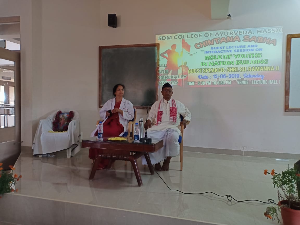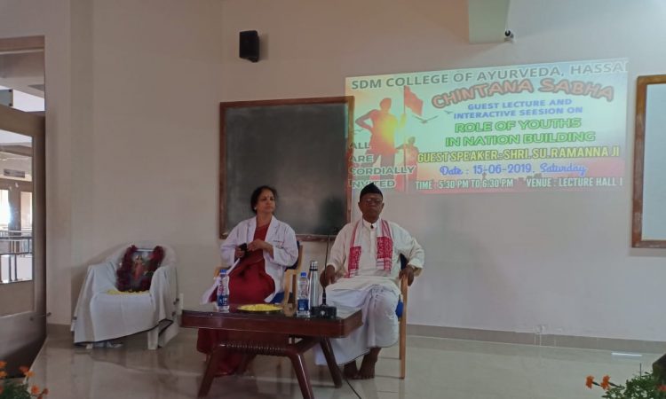 ಹಾಸನ: ಶ್ರೀ ಧರ್ಮಸ್ಥಳ ಮಂಜುನಾಥೇಶ್ವರ ಆಯುರ್ವೇದ ಕಾಲೇಜು ಮತ್ತು ಆಸ್ಪತ್ರೆ, ಹಾಸನ ಶನಿವಾರ ಸಂಜೆ 5.30 ರಿಂದ 6.30 ರ ವರೆಗೆ ‘ಚಿಂತನ ಸಭಾ’ ಕಾರ್ಯಕ್ರಮ ನಡೆಯಿತು. ಮುಖ್ಯ ಅತಿಥಿಗಳಾದ ಅಖಿಲ ಭಾರತೀಯ ಕುಟುಂಬ ಪ್ರಬೋಧಿನಿ ಪ್ರಮುಖ್ ಶ್ರೀ “ಸು.ರಾಮಣ್ಣ” ನವರು ‘ರಾಷ್ಟ್ರೀಯತೆಯಲ್ಲಿ ಯುವಕರ ಪಾತ್ರ ‘ ಎಂಬ ವಿಷಯದ ಬಗ್ಗೆ ಉಪನ್ಯಾಸ ನೀಡಿದರು ಮತ್ತು ಆಯುರ್ವೇದ ವೈದ್ಯ ವಿದ್ಯಾರ್ಥಿಗಳು ಹಾಗೂ ನೆರೆದಿದ್ದ ಉಪನ್ಯಾಸಕರಿಗೆ ಸ್ಫೂರ್ತಿಯನ್ನು ತುಂಬಿದರು. ಕೌಮಾರಭೃತ್ಯ ವಿಭಾಗದ ಮುಖ್ಯಸ್ಥರಾದ ಡಾ. ಶೈಲಜಾ.ಯು ರವರು ಅಧ್ಯಕ್ಷರ ಭಾಷಣ ಮಾಡಿದರು.