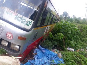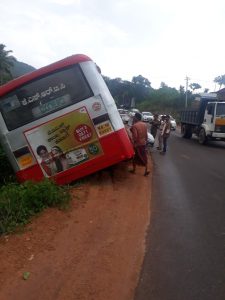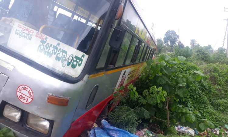 ಸುಬ್ರಹ್ಮಣ್ಯ ಕಡೆಯಿಂದ ಮಂಗಳೂರು ಕಡೆಗೆ ಸುಮಾರು ೪೦ ಮಂದಿ ಪ್ರಯಾಣಿಕರು ಸಂಚಾರ ಮಾಡುತ್ತಿದ್ದ ಕೆ.ಎಸ್.ಆರ್.ಟಿ.ಸಿ.ಬಸ್ ಮಾಣಿ ಸಮೀಪದ ಅಳಿರ ಸಮೀಪಿಸುತ್ತಿದ್ದಂತೆ ಎದುರುಗಡೆಯಿಂದ ಅತಿ ವೇಗದಿಂದ ಬಂದ ಒವರ್ ಟೇಕ್ ಮಾಡುತ್ತಿದ್ದ ಟ್ಯಾಂಕರ್ ಲಾರಿಗೆ ದಾರಿ ಬಿಟ್ಟು ಕೊಡಲು ಹೋಗಿ ಮಳೆ ನೀರು ಹರಿದು ಹೋಗುವ ಚರಂಡಿಗೆ ಇಳಿದು ಓರೆಯಾಗಿ ನಿಂತಿದೆ.