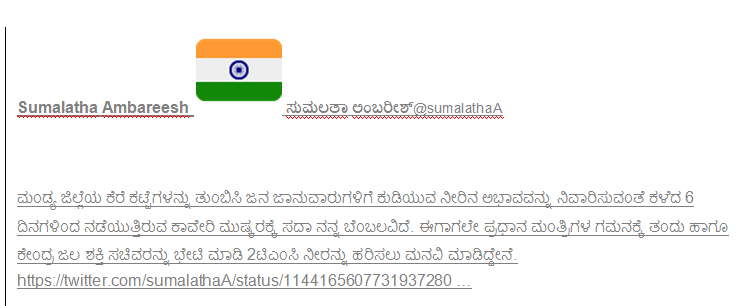 ಮಂಡ್ಯ ಜಿಲ್ಲೆಯ ಕೆರೆ ಕಟ್ಟೆಗಳನ್ನು ತುಂಬಿಸಿ ಜನ ಮತ್ತು ಜಾನುವಾರುಗಳಿಗೆ ಕುಡಿಯುವ ನೀರಿನ ಅಭಾವ ನಿವಾರಿಸುವಂತೆ ರೈತರು ಹೋರಾಟ ನಡೆಸುತ್ತಿದ್ದಾರೆ. ಕಳೆದ ಒಂದು ವಾರದಿಂದ ನಡೆಯುತ್ತಿರುವ ಈ ಕಾವೇರಿ ಮುಷ್ಕರಕ್ಕೆ ಸದಾ ನನ್ನ ಬೆಂಬಲವಿದೆ. ಈಗಾಗಲೇ 2 ಟಿಎಂಸಿ ನೀರನ್ನು ಹರಿಸುವಂತೆ ಪ್ರಧಾನ ಮಂತ್ರಿಗಳ ಗಮನಕ್ಕೆ ತಂದಿದ್ದೇನೆ. ಹಾಗೆಯೇ ಕೇಂದ್ರ ಜಲ ಶಕ್ತಿ ಸಚಿವರಿಗೂ ಮನವಿ ಮಾಡಿದ್ದೇನೆ ಎಂದು ಸುಮಲತಾ ಅಂಬರೀಶ್ ಟ್ವಿಟ್ಟರ್ನಲ್ಲಿ ಬರೆದುಕೊಂಡಿದ್ದಾರೆ.