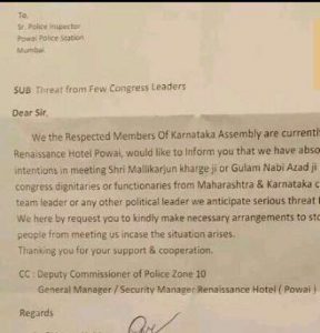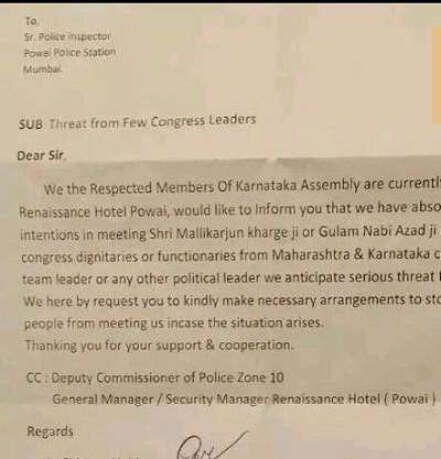 ಕಾಂಗ್ರೆಸ್ ನಾಯಕರಾದ ಮಲ್ಲಿಕಾರ್ಜುನ ಖರ್ಗೆ, ಗುಲಾಮ್ ನಬಿ ಆಜಾದ್ ಅಥವಾ ಮಹಾರಾಷ್ಟ್ರ, ಕರ್ನಾಟಕ ಹಾಗೂ ಯಾವುದೇ ಕಾಂಗ್ರೆಸ್ ನಾಯಕರನ್ನು ಭೇಟಿಯಾಗಲು ನಾವು ಇಚ್ಛಿಸುವುದಿಲ್ಲ, ಜೊತೆಗೆ ಈ ನಾಯಕರಿಂದ ನಮ್ಮ ಜೀವಕ್ಕೆ ಅಪಾಯವಿದೆ ಎಂದು ಅತೃಪ್ತ ಶಾಸಕರು ಲಿಖಿತ ರೂಪದಲ್ಲಿ ಮುಂಬೈನ ಪೊವೈ ಪೊಲೀಸರಿಗೆ ದೂರನ್ನು ನೀಡಿದ್ದಾರೆ.
