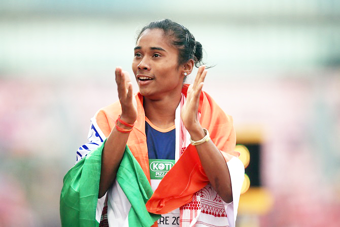 TAMPERE, FINLAND - JULY 12: Hima Das of India celebrates winning gold in the final of the women's 400m on day three of The IAAF World U20 Championships on July 12, 2018 in Tampere, Finland. (Photo by Ben Hoskins/Getty Images for IAAF)