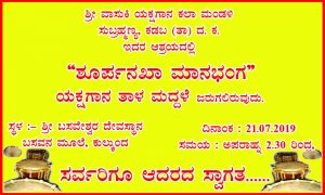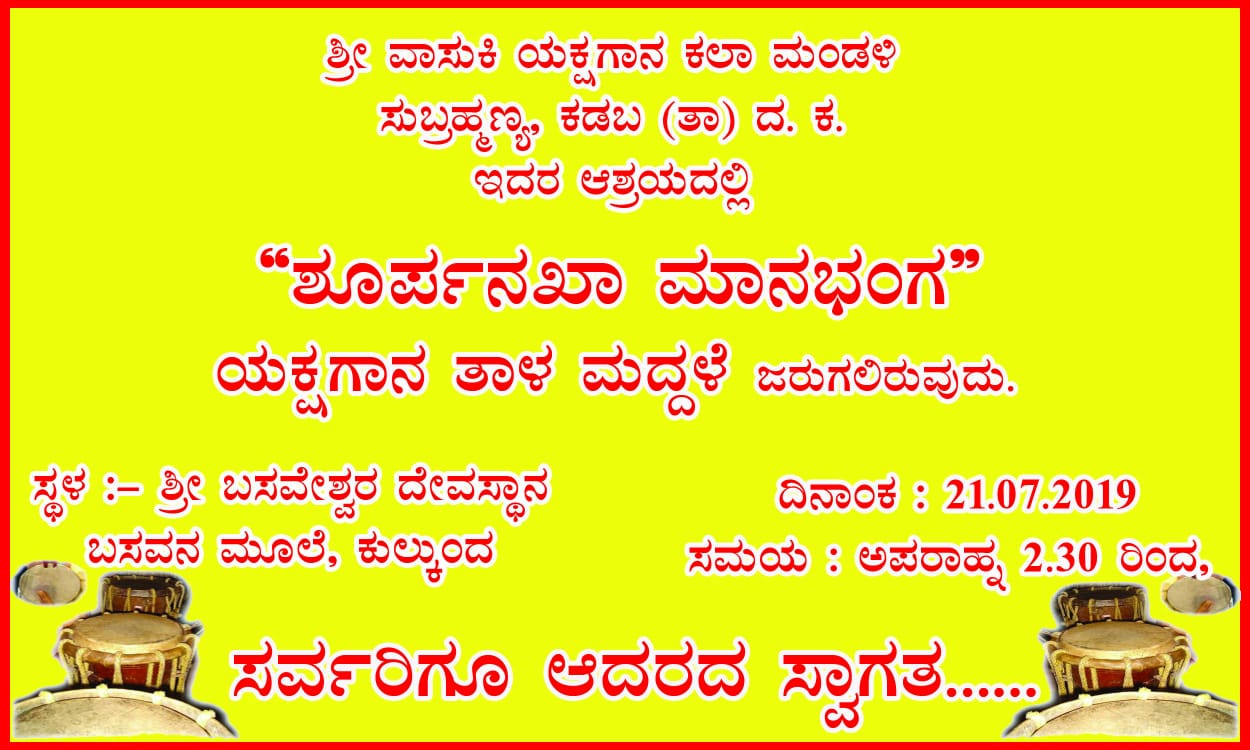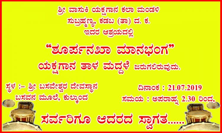 ಸುಬ್ರಹ್ಮಣ್ಯ : ಸುಬ್ರಹ್ಮಣ್ಯ ಶ್ರೀ ವಾಸುಕಿ ಯಕ್ಷಗಾನ ಮಂಡಳಿ ಇದರ ಆಶ್ರಯದಲ್ಲಿ, ಜುಲೈ 21ರಂದು ‘ಶೂರ್ಪನಖಾ ಮಾನಭಂಗ’ ಎಂಬ ಯಕ್ಷಗಾನ ತಾಳಮದ್ದಳೆ ಕಾರ್ಯಕ್ರಮ ಹಮ್ಮಿಕೊಳ್ಳಲಾಗಿದೆ. ಶ್ರೀ ಬಸವೇಶ್ವರ ದೇವಸ್ಥಾನ ಬಸವಮೂಲೆ ಕುಲಕುಂದ ಎಂಬಲ್ಲಿ ನಡೆಯಲಿದೆ. ಶ್ರೀ ವಾಸುಕಿ ಯಕ್ಷಗಾನ ಮಂಡಳಿ ವತಿಯಿಂದ ಸರ್ವರಿಗೂ ಸ್ವಾಗತ ಕೋರಲಾಗಿದೆ.