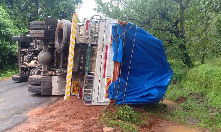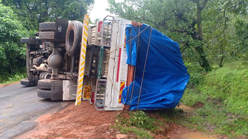 ಮಧ್ಯಾಹ್ನ 11 ಗಂಟೆ ಸುಮಾರಿಗೆ ಘಟನೆ ನಡೆದಿದ್ದು, ಲಾರಿಯಲ್ಲಿ ಚಾಲಕ ಮತ್ತು ನಿರ್ವಾಹಕ ಇದ್ದರು. ದಾವಣಗೆರೆಯಿಂದ ಮಂಗಳೂರು ಕಡೆಗೆ ಚಲಿಸುತ್ತಿದ್ದ ಲಾರಿ ಸ್ಕಿಡ್ ಆಗಿದ್ದರಿಂದ ಮಗುಚಿ ಬಿದ್ದಿದೆ ಎನ್ನಲಾಗಿದೆ.