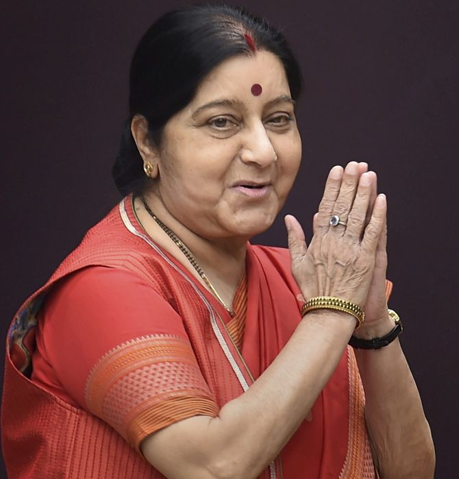 **FILE** New Delhi: In this file photo dated May 5, 2019: Former External Affairs Minister Sushma Swaraj in New Delhi. Swaraj on Tuesday night admitted to AIIMS and her condition is very critical, hospital sources said. (PTI Photo) (PTI8_6_2019_000237B)