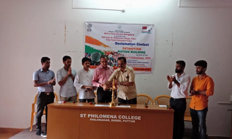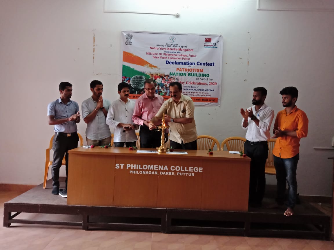 ಭಾರತ ಸರಕಾರದ ಯುವಜನ ವ್ಯವಹಾರ ಹಾಗೂ ಕ್ರೀಡಾ ಸಚಿವಾಲಯದ ವ್ಯಾಪ್ತಿಗೆ ಒಳಪಡುವ ನೆಹರೂ ಯುವ ಕೇಂದ್ರ ಮಂಗಳೂರು, ಸಂತ ಫಿಲೋಮಿನಾ ಕಾಲೇಜಿನ ಎನ್ನೆಸ್ಸೆಸ್ ಘಟಕ, ಪುತ್ತೂರು ತಾಲೂಕು ಯುವಜನ ಒಕ್ಕೂಟ ಇವುಗಳ ಸಂಯುಕ್ತ ಆಶ್ರಯದಲ್ಲಿ ರಾಷ್ಟ್ರಪ್ರೇಮ ಮತ್ತು ರಾಷ್ಟ್ರ ನಿರ್ಮಾಣದ ಧ್ಯೇಯೋದ್ದೇಶದೊಂದಿಗೆ 2020 ರ ಗಣರಾಜ್ಯೋತ್ಸವ ಆಚರಣೆಯ ಅಂಗವಾಗಿ ‘ಸಬ್ಕಾ ಸಾತ್, ಸಬ್ಕಾ ವಿಕಾಸ್, ಸಬ್ಕಾ ವಿಶ್ವಾಸ್’ ಎಂಬ ವಿಷಯದಡಿಯಲ್ಲಿ ಕಾಲೇಜಿನ ಸ್ಪಂದನ ಸಭಾಭವನದಲ್ಲಿ ಸೆಪ್ಟಂಬರ್ 12 ರಂದು ಆಯೋಜಿಸಲಾದ ‘ಡಿಕ್ಲಮೇಶನ್ ಕಂಟೆಸ್ಟ್’ ಇದರ ತಾಲೂಕು ಮಟ್ಟದ ಭಾಷಣ ಸ್ಪರ್ಧೆಯನ್ನು ಉದ್ಘಾಟಿಸಿ, ಮಾತನಾಡಿದರು. ಯುವ ಜನತೆ ಸ್ಪರ್ದೆಗಳಲ್ಲಿ ಭಾಗವಹಿಸುವ ಆಸಕ್ತಿ ಹೊಂದಿರಬೇಕು. ಇದು ವ್ಯಕ್ತಿತ್ವ ವಿಕಸನಕ್ಕೂ ಸಹಕಾರಿಯಾಗುತ್ತದೆ. ಯುವ ಪ್ರತಿಭೆಗಳು ವಿವಿಧ ಹಂತಗಳಲ್ಲಿ ನಡೆಸಲಾಗುವ ಸ್ಪರ್ಧೆಗಳಲ್ಲಿ ಯಶಸ್ವಿಯಾಗಿ ಪಾಲ್ಗೊಂಡು, ರಾಷ್ಟ್ರ ಮಟ್ಟದಲ್ಲಿಯೂ ಮಿನುಗುವಂತಾಗಬೇಕು ಎಂದು ಹಾರೈಸಿದರು.