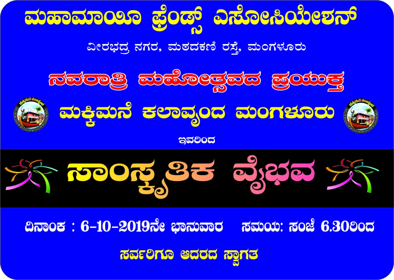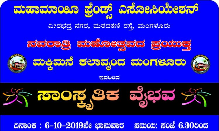 ಮಂಗಳೂರು : ವೀರಭದ್ರ ನಗರದ ಮಠದಕಣಿಯಲ್ಲಿ ಮಹಾಮಾಯಿ ಫ್ರೆಂಡ್ಸ್ ಎಸೋಸಿಯೇಶನ್ರವರ ನವರಾತ್ರಿ ಮಹೋತ್ಸವ 42ನೇ ವಾರ್ಷಿಕೋತ್ಸವದ ಪ್ರಯುಕ್ತ ಅ. 6 ರಂದು ಸಂಜೆ 6.30 ರಿಂದ ಸುದೇಶ್ ಜೈನ್ ಮಕ್ಕಿಮನೆ ನೇತೃತ್ವದ ಮಕ್ಕಿಮನೆ ಕಲಾವೃಂದದಿಂದ ಸಾಂಸ್ಕೃತಿಕ ವೈಭವ ಕಾರ್ಯಕ್ರಮ ಜರಗಲಿದೆ .