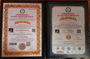 ಬೆಂಗಳೂರು :– ಗ್ರಾಮೀಣಾಭಿವೃದ್ಧಿ ಹಾಗೂ ಪಂಚಾಯತ್ ರಾಜ್ ಇಲಾಖೆ ಸ್ಥಳೀಯಾಡಳಿತ ಗ್ರಾಮ ಪಂಚಾಯತ್ ಧರ್ಮಸ್ಥಳ ಕ್ಲರ್ಕ್ ಆಗಿ ಸೇವೆ ಸಲ್ಲಿಸುತ್ತಿರುವ ದೇವಿಪ್ರಸಾದ್ ಬೊಳ್ಮ ಧರ್ಮಸ್ಥಳ ಇವರು ಕರ್ನಾಟಕ ರಾಜ್ಯ ಗ್ರಾಮ ಪಂಚಾಯಿತಿ ನೌಕರರ ಶ್ರೇಯೋಭಿವೃದ್ಧಿ ಸಂಘ ಖಆPಖ ರಾಜ್ಯ ಸಮಿತಿ ಇದರ ರಾಜ್ಯಾಧ್ಯಕ್ಷರಾಗಿ ಕೆಲಸ ಮಾಡುತ್ತಿರುವ ಇವರ ಸಂಘಟನೆ ಮತ್ತು ಸಮಾಜ ಸೇವೆಯನ್ನು ಗುರುತಿಸಿ ರಾಜ್ಯ ಮಟ್ಟದ ಅಧಿಕಾರಿಗಳು ಹಾಗೂ ರಾಜ್ಯದ 5 ಸಂಘ ಸಂಸ್ಥೆಗಳ ಶಿಫಾರಸಿನಂತೆ ಇಂಟರ್ ನ್ಯಾಶನಲ್ ಗ್ಲೋಬಲ್ ಪೀಸ್ ಯುನಿವರ್ಸಿಟಿ ಇವರು ದಕ್ಷಿಣ ಭಾರತದ ಹೊಸೂರಿನಲ್ಲಿ ದಿನಾಂಕ 29/09/2019 ರಂದು ನಡೆದ ಕಾರ್ಯಕ್ರಮದಲ್ಲಿ ಗೌರವ ಡಾಕ್ಟರೇಟ್ ನೀಡಿ ಗೌರವಿಸಿದೆ.