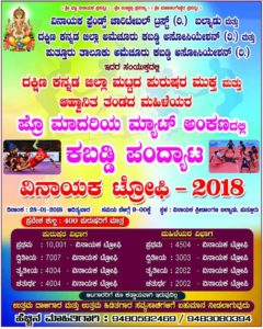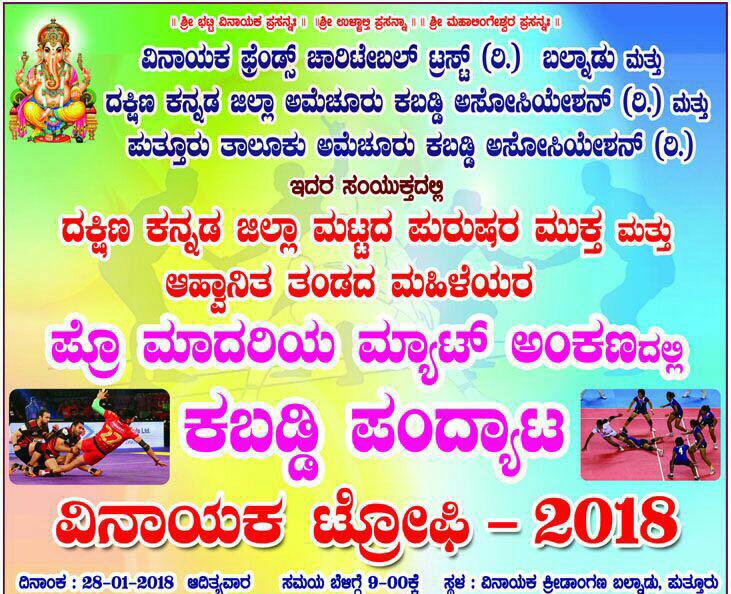 ಪುತ್ತೂರು : ತಾಯಿ ಉಳ್ಳಾಲ್ತಿಯ ನೆಲ ಪುತ್ತೂರಿನ ಬಲ್ನಾಡಿನಲ್ಲಿ ವಿನಾಯಕ ಫ್ರೇಂಡ್ಸ್ ಚಾರಿಟೇಬಲ್ ಟ್ರಸ್ಟ್ ಮತ್ತು ಅಮೆಚೂರ್ ಸಂಯುಕ್ತ ಆಶ್ರಯದಲ್ಲಿ ಫ್ರೋ ಕಬಡ್ಡಿ ಮಾದರಿಯ ‘ ವಿನಾಯಕ ಟ್ರೋಫಿ – 2018 ‘ ಕಬಡ್ಡಿ ಪಂದ್ಯಾಟವು ಆದಿತ್ಯವಾರ 28 ಫೆಬ್ರವರಿಯಂದು ಬೆಳಗ್ಗೆ 9.00 ಗಂಟೆಗೆ ಉದ್ಘಾಟಿಸಲ್ಪಡಲಿದೆ.
