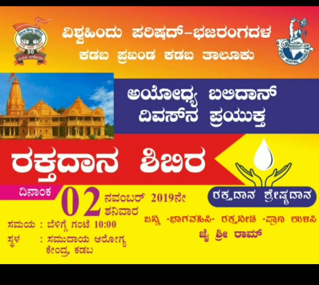 ಕಡಬ: ವಿಶ್ವ ಹಿಂದೂ ಪರಿಷತ್ ಭಜರಂಗದಳ ಕಡಬ ಪ್ರಖಂಡ ಕಡಬ ತಾಲೂಕು ಇದರ ಆಶ್ರಯದಲ್ಲಿ, ರೋಟರಿ ಕ್ಯಾಂಪ್ಕೋ ಬ್ಲಡ್ ಬ್ಯಾಂಕ್ ಪುತ್ತೂರು ಹಾಗೂ ಸಮುದಾಯ ಆರೋಗ್ಯ ಕೇಂದ್ರ ಕಡಬ ಇದರ ಸಹಯೋಗದಲ್ಲಿ, ನಾಳೆ ಶ್ರೀ ರಾಮ ಜನ್ಮಭೂಮಿ ಅಯೋಧ್ಯೆಯಲ್ಲಿ ನಡೆದ ಕರಸೇವೆಯ ಸಂದರ್ಭದಲ್ಲಿ, ಹುತಾತ್ಮರಾದ ಬಂಧುಗಳು ಬಲಿದಾನವನ್ನು ಸ್ಮರಿಸುವ ಸಲುವಾಗಿ ಬೃಹತ್ ರಕ್ತದಾನ ಶಿಬಿರ ಆಯೋಜಿಸಲಾಗಿದೆ.