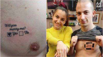 ಇಂಗ್ಲೆಂಡಿನ ಯುವಕನೊಬ್ಬ ತನ್ನ ಎದೆಯ ಮೇಲೆ ನನ್ನ ಮದುವೆ ಆಗುತ್ತಿಯಾ ಎಂದು ಟ್ಯಾಟೂ ಮಾಡಿಸಿಕೊಂಡು ಮದುವೆಯ ಪ್ರಪೋಸ್ ಮಾಡಿ ಸುದ್ದಿಯಾಗಿದ್ದಾನೆ.