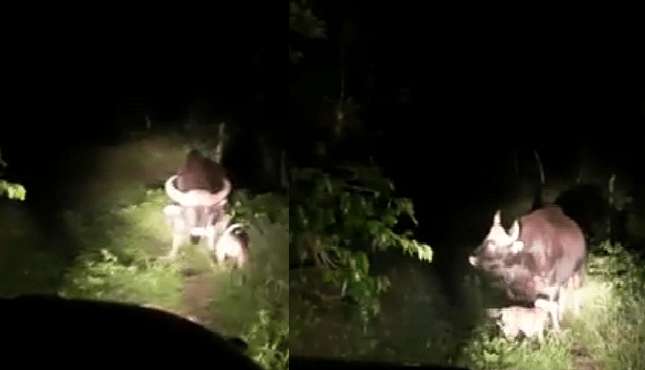 ಕೊನೆಗೂ ಜೀಪ್ ನಲ್ಲಿದ್ದ ಮಾಲೀಕ ಎಷ್ಟೇ ಕೂಗಿದರೂ ನಾಯಿ ಮಾತ್ರ ಪಟ್ಟು ಬಿಡಲಿಲ್ಲ, ರಾಜಾರೋಷದಿಂದ ಕಾಡುಕೋಣವನ್ನು ನಾಯಿ ಹೆದರಿಸಲು ಮುಂದಾಗಿದೆ, ಕೊಂಬಿನಿಂದ ಎತ್ತಿ ಎಸೆಯಲು ಕಾಡುಕೋಣ ಮುಂದಾದ್ರೂ ನಾಯಿ ಕೊಂಚ ಕೂಡ ಅಂಜಲಿಲ್ಲ, ಕಾಡುಕೋಣಗಳ ಕೊಂಬಿಗಳಿಂದ ತಪ್ಪಿಸಿಕೊಂಡಿದೆ. ಬಳಿಕ ಬಂದ ದಾರಿಗೆ ಸುಂಕವಿಲ್ಲವೆಂಬಂತೆ ನಾಯಿ ವಾಪಸ್ ಕಾಡಿನತ್ತ ಓಡಿದೆ, ಆದರೂ ಬಿಡದ ಧೀರ ಶ್ವಾನ ಅದನ್ನು ಬೆನ್ನಟ್ಟಿಸಿಕೊಂಡು ಹೋಗಿದೆ. ಈ ದೃಶ್ಯ ಮೊಬೈಲ್ ನಲ್ಲಿ ಸೆರೆಯಾಗಿದೆ