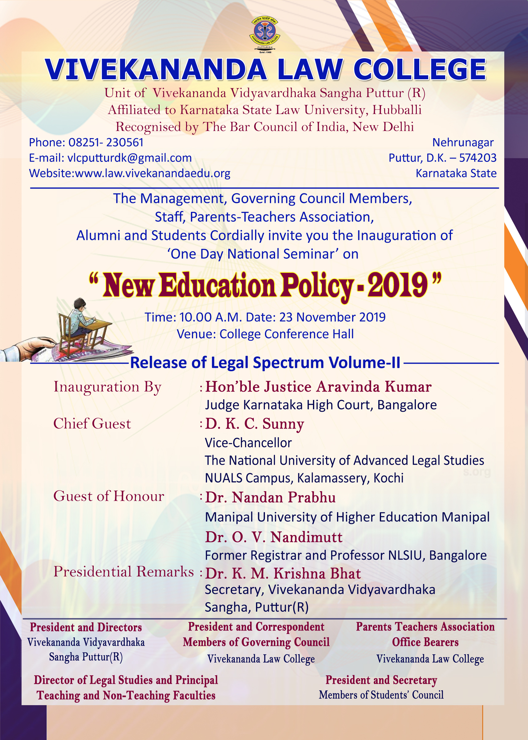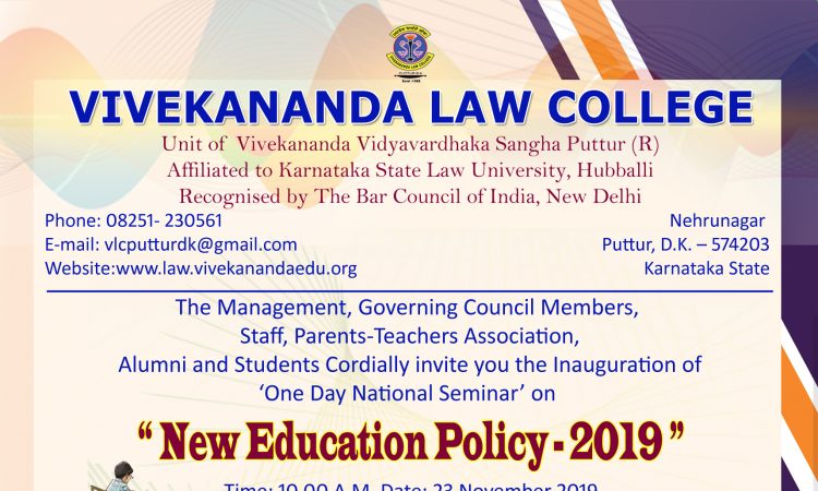 ವಿವೇಕಾನಂದ ಕಾನೂನು ಮಹಾವಿದ್ಯಾಲಯದಲ್ಲಿ ‘ನೂತನ ರಾಷ್ಟ್ರೀಯ ಶಿಕ್ಷಣ ನೀತಿ – 2019’ ರ ಕುರಿತು ರಾಷ್ಟ್ರ ಮಟ್ಟದ ವಿಚಾರ ಸಂಕಿರಣ ಕಾರ್ಯಕ್ರಮವು ದಿನಾಂಕ 23-11-2019 ರಂದು ಕಾನೂನು ಕಾಲೇಜಿನ ಸಭಾಂಗಣದಲ್ಲಿ ನಡೆಯಲಿದೆ.