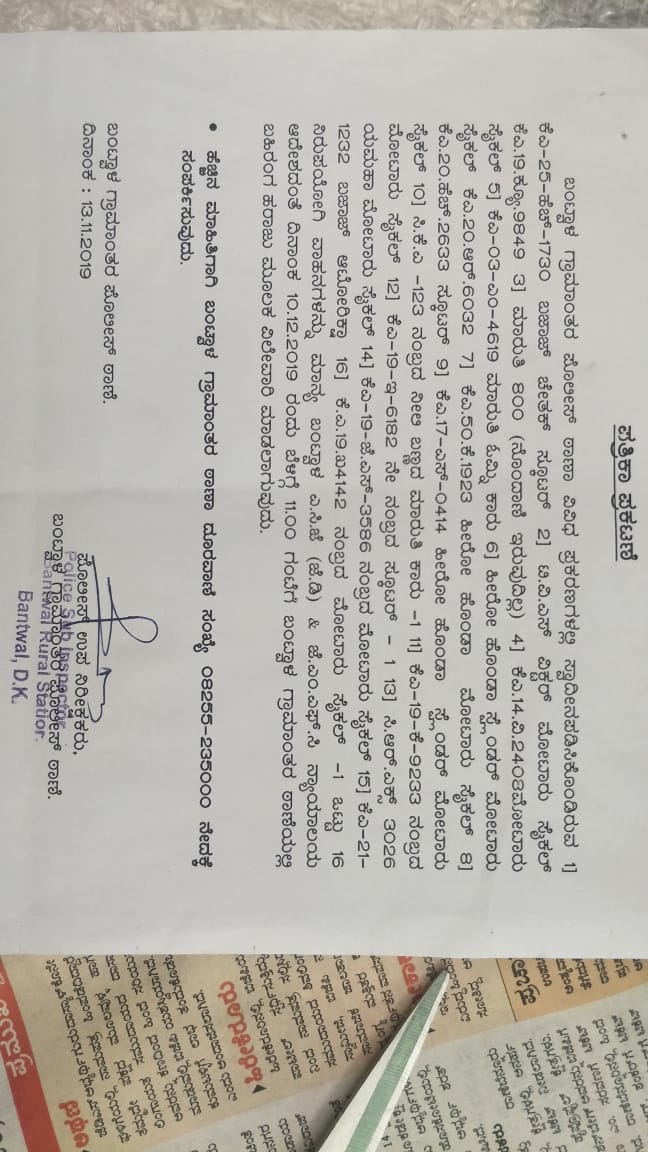 ಬಂಟ್ವಾಳ: ಬಂಟ್ವಾಳ ಗ್ರಾಮಾಂತರ ಪೆÇೀಲೀಸ್ ಠಾಣೆಯಲ್ಲಿ ವಿವಿಧ ಪ್ರಕರಣದಲ್ಲಿ ಸ್ವಾಧೀನ ಪಡಿಸಿಕೊಂಡಿರುವ ಒಟ್ಟು 16 ನಿರುಪಯೋಗಿ ವಾಹನಗಳನ್ನು ಬಂಟ್ವಾಳ ಎ.ಸಿ.ಜೆ ಮತ್ತು ಜೆ.ಎಂ.ಎಫ್.ಸಿ. ನ್ಯಾಯಾಲಯದ ಅದೇಶದಂತೆ ಡಿ.10 ರಂದು ಬೆಳಿಗ್ಗೆ 11ಗಂಟೆಗೆ ಗ್ರಾಮಾಂತರ ಪೊಲೀಸ್ ಠಾಣೆಯಲ್ಲಿ ಬಹಿರಂಗ ಹರಾಜು ಮಾಡಲಾಗುವುದು ಎಂದು ಬಂಟ್ವಾಳ ಗ್ರಾಮಾಂತರ ಪೊಲೀಸ್ ಠಾಣಾ ಎಸ್.ಐ. ಪ್ರಸನ್ನ ತಿಳಿಸಿದ್ದಾರೆ.