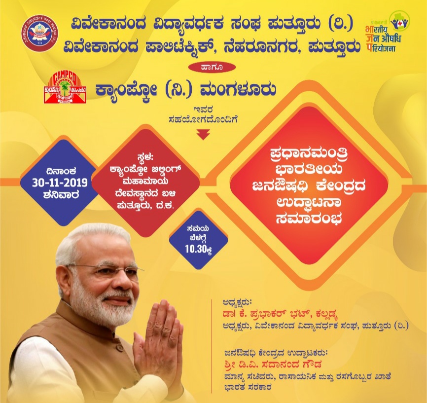 ಸಮಾರಂಭದಲ್ಲಿ ಅಧ್ಯಕ್ಷತೆಯನ್ನು ವಿವೇಕಾನಂದ ವಿದ್ಯಾವರ್ಧಕ ಸಂಘದ ಅಧ್ಯಕ್ಷರಾದ ಡಾ.ಕೆ. ಪ್ರಭಾಕರ್ ಭಟ್ ಕಲ್ಲಡ್ಕ ವಹಿಸಲಿದ್ದು, ಜನ ಔಷಧಿ ಕೇಂದ್ರದ ಉದ್ಘಾಟನೆಯನ್ನು ಕೇಂದ್ರ ಸಚಿವ ಡಿ.ವಿ. ಸದಾನಂದ ಗೌಡ ನೆರವೇರಿಸಲಿದ್ದಾರೆ.