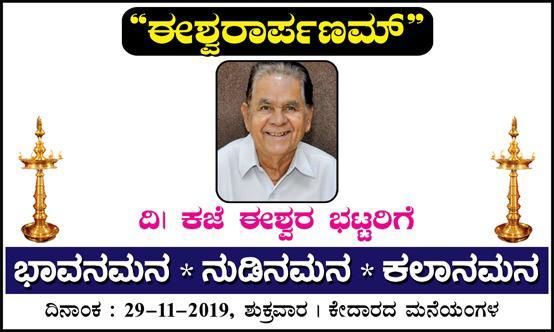ಭಾವನಮನ – ನುಡಿನಮನ – ಕಲಾನಮನ ಎಂಬ ಅರ್ಥಪೂರ್ಣ ಕಾರ್ಯಕ್ರಮ ” ಈಶ್ವರಾರ್ಪಣಮ್ ” ಎಂದ ಹೆಸರಿನಲ್ಲಿ ನಡೆಯಲಿದ್ದು, ಮಧ್ಯಾಹ್ನ 2.00 ರಿಂದ 3.30ರ ವರೆಗೆ ಅವರ ಒಡನಾಟದ ನೆನಪಿನಂಗಳದಿಂದ ಒಡಲಾಳದ ಸವಿಮುತ್ತುಗಳನ್ನು ಆಯ್ದ ಬಳಗಬಂಧು : ಡಾ ತಾಳ್ತಜೆ ವಸಂತಕುಮಾರ, ಯಕ್ಷಬಂಧು : ಉಜಿರೆ ಅಶೋಕ ಭಟ್ಟ, ಸಾಹಿತ್ಯಬಂಧು : ಡಾ.ವರದರಾಜ ಚಂದ್ರಗಿರಿ , ಸಹಕಾರಿ ಬಂಧು : ಕೊಂಕೋಡಿ ಪದ್ಮನಾಭ, ಸಂಘಟಕ ಬಂಧು : ಡಾ. ಗಿರಿಧರ ಕಜೆ ಪ್ರಸ್ತುತಿಯನ್ನು ಮಾಡಲಿದ್ದರೆ.