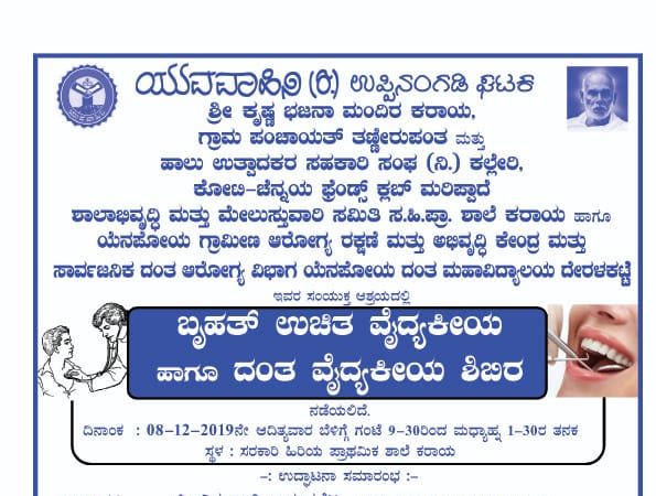 ದಿನಾಂಕ 8-12-2019ರ ಭಾನುವಾರದಂದು ಸಮಯ ಸರಿಯಾಗಿ ಬೆಳಿಗ್ಗೆ 9.30ರಿಂದ ಮದ್ಯಾಹ್ನ 1.30ರ ತನಕ ಸರಕಾರಿ ಹಿರಿಯ ಪ್ರಾಥಮಿಕ ಶಾಲೆ ಕರಾಯ ಇಲ್ಲಿ ಯುವವಾಹಿನಿ (ರಿ) ಉಪ್ಪಿನಂಗಡಿ ಘಟಕ ಹಾಗೂ ಶ್ರೀ ಕೃಷ್ಣ ಭಜನಾ ಮಂದಿರ ಕರಾಯ, ಗ್ರಾಮ ಪಂಚಾಯತ್ ತಣ್ಣೀರುಪಂತ, ಹಾಲು ಉತ್ಪಾದಕರ ಸಹಕಾರಿ ಸಂಘ ಕಲ್ಲೇರಿ, ಕೋಟಿ ಚೆನ್ನಯ ಫ್ರೆಂಡ್ಸ್ ಕ್ಲಬ್ ಮರಿಪಾದ್ದೆ, ಶಾಲಾಭಿವೃದ್ಧಿ ಮತ್ತು ಮೇಲುಸ್ತುವಾರಿ ಸಮಿತಿ ಸ.ಹಿ.ಪ್ರಾ. ಶಾಲೆ ಕರಾಯ ಹಾಗೂ ಯೆನಪೋಯ ಗ್ರಾಮೀಣ ಆರೋಗ್ಯ ರಕ್ಷಣೆ ಮತ್ತು ಸಾರ್ವಜನಿಕ ದಂತ ಆರೋಗ್ಯ ವಿಭಾಗ ಯೆನಪೋಯ ದಂತ ಮಹಾವಿದ್ಯಾಲಯ ದೇರಳಕಟ್ಟೆ ಇವರ ಸಹಕಾರದೊಂದಿಗೆ ಬೃಹತ್ ಉಚಿತ ವೈದ್ಯಕೀಯ ಹಾಗೂ ದಂತ ವೈದ್ಯಕೀಯ ಶಿಬಿರ ನಡೆಯಲಿದೆ. ಇನ್ನು ಕಾರ್ಯಕ್ರಮದ ಉದ್ಘಾಟನೆಯನ್ನು ನಿರಂಜನ್ ಬಾವಂತಬೆಟ್ಟು ನೆರವೇರಿಸಲಿದ್ದಾರೆ. ಕಾರ್ಯಕ್ರಮದ ಅಧ್ಯಕ್ಷತೆಯನ್ನು ಡಾ| ಆಶಿತ್ ಎಂ.ವಿ ವಹಿಲಿದ್ದು. ಇನ್ನು ಮುಖ್ಯ ಅತಿಥಿಗಳಾಗಿ ಡಾ| ರಾಜಾರಾಮ್ಕೆ.ಬಿ, ಜಯವಿಕ್ರಂ ಕಲ್ಲಾಪು, ಪೂರ್ಣಿಮಾ, ಜಗದೀಶ ಶೆಟ್ಟಿ ಮೈರ, ಜಯರಾಮ್ ಸಾಲಿಯಾನ್. ಮತ್ತಿತರರು ಕಾರ್ಯಕ್ರಮದಲ್ಲಿ ಭಾಗವಹಿಸಲಿದ್ದಾರೆ.