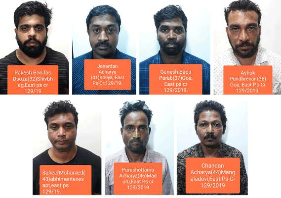 ಶಿವಭಾಗ್ ಕದ್ರಿ ನಿವಾಸಿ ರಾಕೇಶ್ ಬೋನಿಪಾಸ್ ಡಿಸೋಜ(37), ಗೋವಾ ಮಡಗಾಂವ್ ನಿವಾಸಿಗಳಾದ ಅಶೋಕ್ ಬಂಡ್ರಗಾರ್ (36), ಗಣೇಶ್ ಬಾಪು ಪರಾಬ್ (37), ಬೆಂದೂರ್ವೆಲ್ ನಿವಾಸಿ ಶಾಹೀರ್ ಮುಹಮ್ಮದ್ (43), ಸೋಮೇಶ್ವರ ನಿವಾಸಿ ಜನಾರ್ದನ ಆಚಾರ್ಯ (41), ಮಂಗಳಾದೇವಿ ನಿವಾಸಿ ಚಂದನ್ ಆಚಾರ್ಯ (44) ಹಾಗೂ ಕೋಟೆಕಾರ್ ಬೀರಿ ನಿವಾಸಿ ಪುರುಷೊತ್ತಮ್ ಆಚಾರ್ಯ (46) ಬಂಧಿತ ಆರೋಪಿಗಳು.