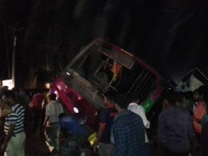 ಕೊಲ್ಲೂರಿನಿಂದ ಮಂಗಳೂರು ಕಡೆಗೆ ಅತೀ ವೇಗದಿಂದ ಬರುತ್ತಿದ್ದ ಬಸ್ಸು ಆಲಂಗಾರು ಬಳಿ ಚಾಲಕನ ನಿಯಂತ್ರಣ ತಪ್ಪಿ ಪಲ್ಟಿ ಹೊಡೆದಿದೆ ಈ ಸಂದರ್ಭ ಮೂಡುಬಿದಿರೆ ಗಾಂಧಿನಗರದ ಸುಮಾ ಎಂಬವರಿಗೆ ತೀವ್ರ ತರಹದ ಗಾಯಗಳಾಗಿದ್ದು ಅವರನ್ನು ಖಾಸಗಿ ಆಸ್ಪತ್ರೆಗೆ ದಾಖಲಿಸಲಾಗಿದೆ. ಉಳಿದ ಗಾಯಗೊಂಡಿರುವ ಪ್ರಯಾಣಿಕರನ್ನು ಪೊಲೀಸ್ ನಿರೀಕ್ಷಕ ದಿನೇಶ್ ಕುಮಾರ್, ಸಿಬ್ಬಂದಿಗಳು ಹಾಗೂ ಸಾರ್ವಜನಿಕರು ಸಾರ್ವಜನಿಕರು ಆಸ್ಪತ್ರೆಗೆ ಸಾಗಿಸಲು ಸಹಕರಿಸಿದ್ದಾರೆ.