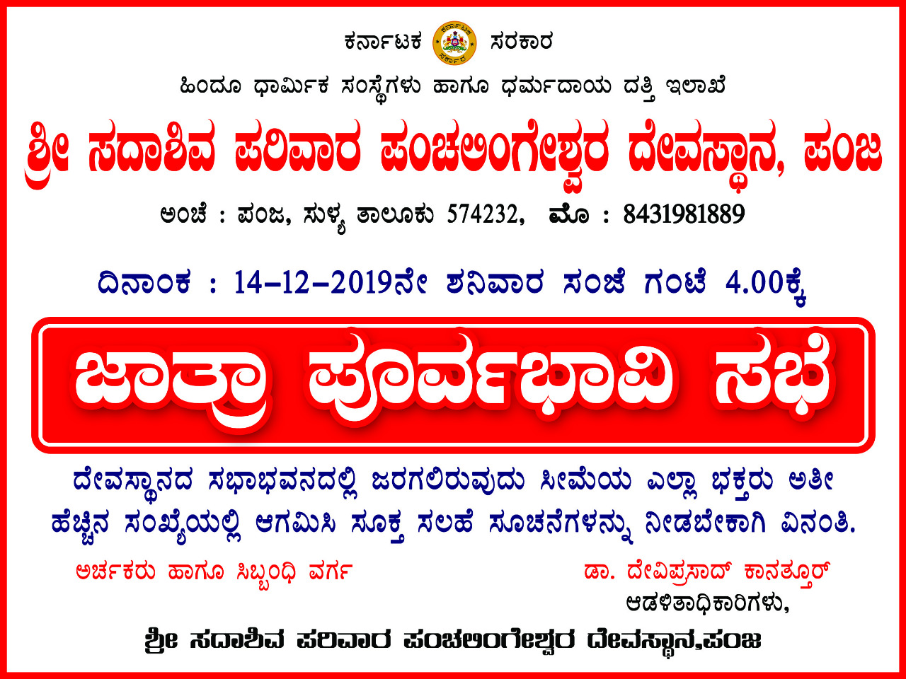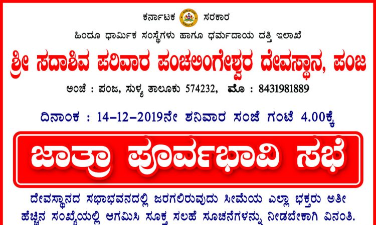 ಪಂಜ: ಪಂಜ ಶ್ರೀ ಸದಾಶಿವ ಪರಿವಾರ ಪಂಚಲಿಂಗೇಶ್ವರ ದೇವಸ್ಥಾನದ ಜಾತ್ರಾ ಪೂರ್ವಭಾವಿ ಸಭೆಯು, ಡಿಸೆಂಬರ್ 14 ರಂದು, ಸಂಜೆ 4ಕ್ಕೆ ದೇವಸ್ಥಾನದ ಸಭಾಭವನದಲ್ಲಿ ಜರುಗಲಿದೆ.