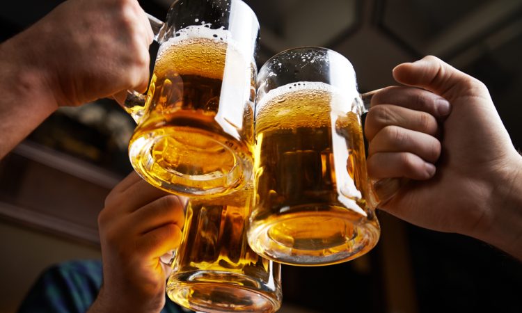 Hands of three men toasting with beer