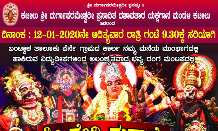 ಕಟೀಲು ಶ್ರೀ ದುರ್ಗಾ ಪರಮೇಶ್ವರೀ ಪ್ರಸಾದಿತ ದಶಾವತಾರ ಯಕ್ಷಗಾನ ಮಂಡಳಿ ಕಟೀಲು ಇವರ ಆಶ್ರಯದಲ್ಲಿ ನಾಳೆ ರಾತ್ರಿ 9.30 ಕ್ಕೆ ಬಂಟ್ವಾಳ ತಾಲೂಕು ಪೆರ್ನೆ ಗ್ರಾಮದ ಕಾರ್ಲ ಗಿರಿಜ ಮತ್ತು ಮಕ್ಕಳ ಸೇವೆಯ ಅಂಗವಾಗಿ ಶ್ರೀ ದೇವಿ ಮಹಾತ್ಮೆ ಯಕ್ಷಗಾನ ಗಿರಿಜರವರ ಮನೆಯ ಮುಂಭಾಗ ನಡೆಯಲಿದೆ.