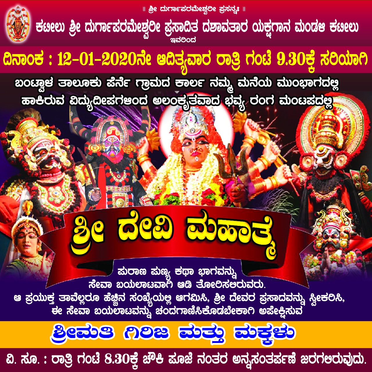 ಚೌಕಿ ಪೂಜೆ ಬಳಿಕ ಅನ್ನ ಸಂತರ್ಪಣೆ ನಡೆಯಲಿದ್ದು, ಪುರಾಣ ಪುಣ್ಯ ಕಥಾ ಭಾಗವನ್ನು ಸೇವಾ ಬಯಲಾಟವಾಗಿ ಆಡಿ ತೋರಿಸಲಿರುವರು. ಈ ಪ್ರಯುಕ್ತ ಕಲಾಭಿಮಾನಿಗಳಾದ ತಾವೆಲ್ಲರೂ ಬಂದು ಶ್ರೀ ದೇವಿಯ ಪ್ರಸಾದವನ್ನು ಸ್ವೀಕರಿಸಿ, ಈ ಯಕ್ಷಗಾನ ಬಯಲಾಟವನ್ನು ಚಂದಗಾಣಿಸಿಕೊಡಬೇಕಾಗಿ ಅಪೇಕ್ಷಿಸುವ ಗಿರಿಜ ಮತ್ತು ಮಕ್ಕಳು ಕಾರ್ಲ ಪೆರ್ನೆ