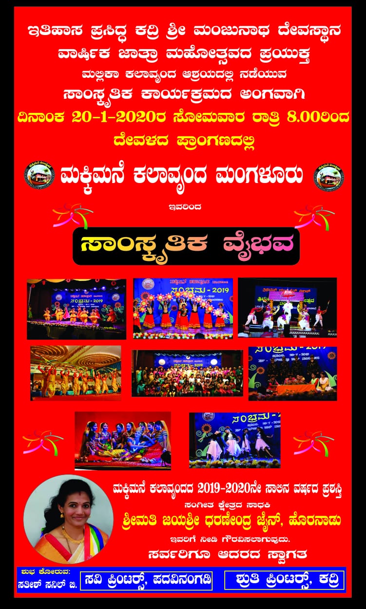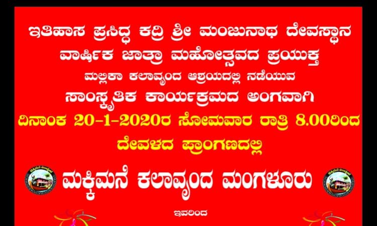 ಜ. 20 ಕ್ಕೆ ಮಕ್ಕಿಮನೆ ಕಲಾವೃಂದ ಮಂಗಳೂರು ಇವರಿಂದ ಸಾಂಸ್ಕೃತಿಕ ವೈಭವ ಹಾಗೂ 2019 -2020 ನೇ ಸಾಲಿನ ವರ್ಷದ ಗೌರವ ಪ್ರಶಸ್ತಿ ಪ್ರಧಾನ ಕಾರ್ಯಕ್ರಮ ನಡೆಯಲಿದೆ