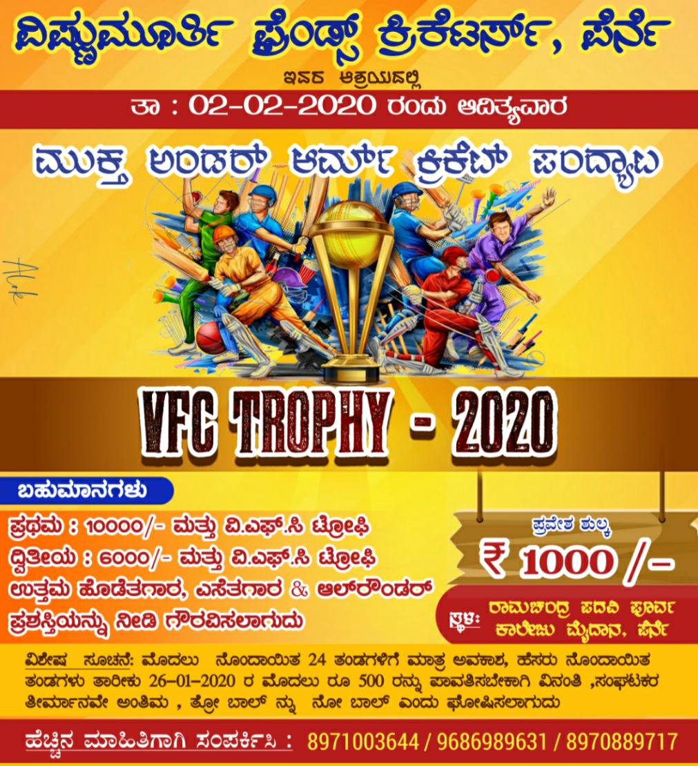 ಪೆರ್ನೆ : ವಿಷ್ಣು ಕ್ರಿಕೆಟ್ ಪೆರ್ನೆ ಇದರ ಆಶ್ರಯದಲ್ಲಿ ಪ್ರಥಮ ವರ್ಷದ, 11 ಜನರ ಮುಕ್ತ ಅಂಡರ್ ಆರ್ಮ್ ಕ್ರಿಕೆಟ್ ಪಂದ್ಯಾಟ VFC ಟ್ರೋಫಿ 2020, ನಾಳೆ ಪೆರ್ನೆ ಶ್ರೀ ರಾಮಚಂದ್ರ ಪದವಿ ಪೂರ್ವ ವಿದ್ಯಾಲಯದ, ಕ್ರೀಡಾಂಗಣದಲ್ಲಿ ನಡೆಯಲಿದೆ.
