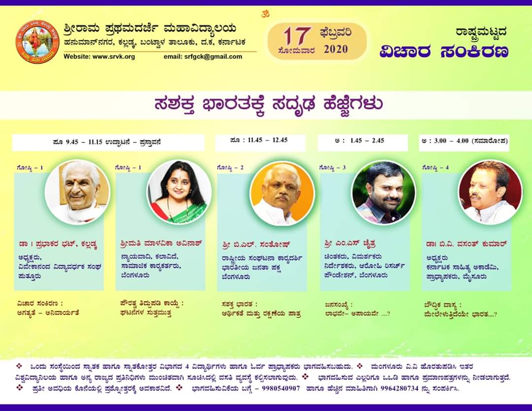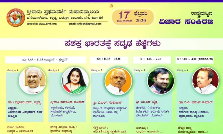 ಫೆಬ್ರವರಿ 17 ರಂದು ರಾಷ್ಟ್ರ ಮಟ್ಟದ ವಿಚಾರ ಸಂಕಿರಣ ಸಶಕ್ತ ಭಾರತಕ್ಕೆ ಸದೃಢ ಹೆಜ್ಜೆಗಳು ಎಂಬ ಕಾರ್ಯಕ್ರಮ, ಹನುಮಾನ್ ನಗರ ಕಲ್ಲಡ್ಕ ಶ್ರೀ ರಾಮ ಪ್ರಥಮ ದರ್ಜೆ ಮಹಾವಿದ್ಯಾಲಯಲ್ಲಿ ನಡೆಯಲಿದೆ. ವಿವೇಕಾನಂದ ವಿದ್ಯಾವರ್ಧಕ ಸಂಘದ ಅಧ್ಯಕ್ಷರಾದ ಡಾ. ಪ್ರಭಾಕರ ಭಟ್ ಕಲ್ಲಡ್ಕ ‘ಅಗತ್ಯತೆ ಅನಿವಾರ್ಯತೆ’ ಎಂಬ ಕುರಿತು ವಿಚಾರ ಸಂಕಿರಣ ಮಾಡಲಿದ್ದಾರೆ.