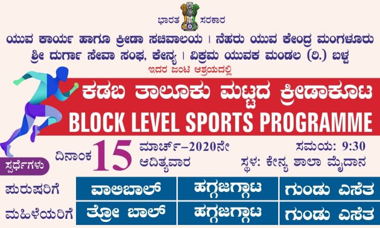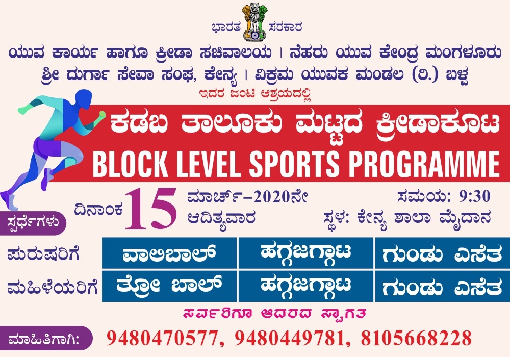 ಕೇನ್ಯ: ಯುವ ಕಾರ್ಯ ಹಾಗು ಕ್ರೀಡಾ ಸಚಿವಾಲಯ, ನೆಹರು ಯುವ ಕೇಂದ್ರ ಮಂಗಳೂರು, ಶ್ರೀ ದುರ್ಗಾ ಸೇವಾ ಸಂಘ ಕೇನ್ಯ, ವಿಕ್ರಮ್ ಯುವಕ ಮಂಡಲ ಬಳ್ಪ ಇದರ ಜಂಟಿ ಆಶ್ರಯದಲ್ಲಿ, ಇದೇ ಬರುವ ಮಾಚ್ 15 ರಂದು ಕೇನ್ಯ ಶಾಲಾ ಮೈದಾನದಲ್ಲಿ ಕಡಬ ತಾಲೂಕು ಮಟ್ಟದ ಕ್ರೀಡಾಕೂಟ ನಡೆಯಲಿದೆ.