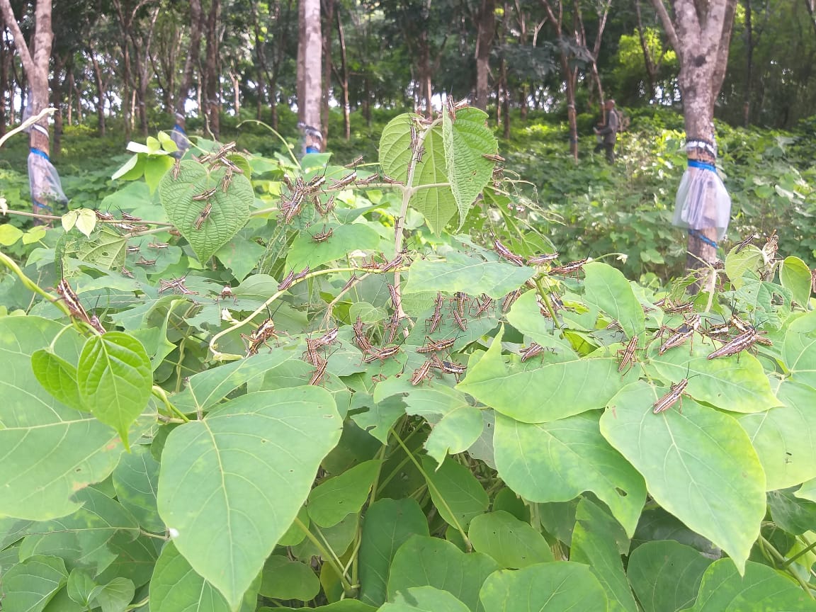 ಮಂಗಳೂರು:ದಕ್ಷಿಣಕನ್ನಡ ಜಿಲ್ಲೆಯ ಬೆಳ್ತಂಗಡಿ ಮತ್ತು ಕಡಬ ತಾಲೂಕಿನ ಕೆಲವೆಡೆ ಮಿಡತೆ ಹಾವಳಿ ಕಂಡು ಬಂದಿದ್ದು ಇದೀಗ ಕರಾವಳಿಯಾದ್ಯಂತ ಮಿಡತೆ ಹಾವಳಿಯ ಬೀತಿ ಎದುರಾಗಿದೆ. ಬೆಳ್ತಂಗಡಿ ತಾಲೂಕಿನ ಕರಂಬಾರು ಗ್ರಾಮ ಪಂಚಾಯತ್ ವ್ಯಾಪ್ತಿಯ ಪಾದೆ ಅನೀಶ್ ಎಂಬವರ ತೋಟದಲ್ಲಿ ಇಂದು ಮಧ್ಯಾಹ್ನ ಮಿಡತೆಗಳ ಗುಂಪು ಕಂಡುಬಂದಿದೆ. ಅನೀಶ್ ಅವರು ಇಂದು ಮಧ್ಯಾಹ್ನ ತನ್ನ ರಬ್ಬರ್ ತೊಟದಲ್ಲಿ ಹೋಗಿ ನೋಡಿದಾಗ ಮಿಡತೆಗಳು ರಬ್ಬರ್ ಗಿಡಗಳ ಕೆಳಗೆ ಇರುವ ಗಿಡ ಬಳ್ಳಿಗಳ ಸೊಪ್ಪುಗಳನ್ನು ತಿನ್ನುವುದನ್ನು ಗಮನಿಸಿದಾಗ ಮಿಡತೆಗಳ ಹಿಂಡು ಕಂಡುಬಂದಿದೆ.