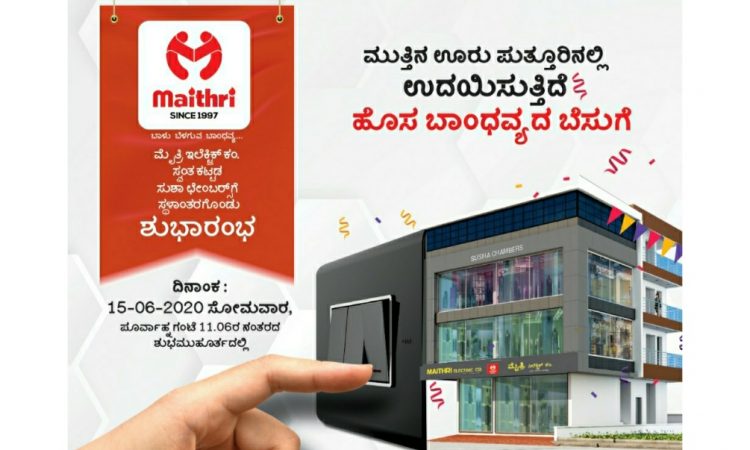 ಪುತ್ತೂರು: ಹತ್ತೂರಿಗೂ ಇಲೆಕ್ಟ್ರಿಕ್ ಉತ್ಸವನ್ನಗಳ ಮಾಟರದ ಪುತ್ತೂರಿನ ಅತ್ಯುತ್ತಮ ಮಳಿಗೆ ಎಂದರೆ ಅದು ಮೈತ್ರಿ ಇಲೆಕ್ಟ್ರಿಕ್ ಕಂಪನಿ. ಎಸ್, 1997 ರಲ್ಲಿ ಪುತ್ತೂರಿನ ಮಹಾಲಿಂಗೇಶ್ವರ ದೇವಸ್ಥಾನದ ಎದುರಿನಲ್ಲಿ ಪ್ರಾರಂಭಗೊಂಡ ಮೈತ್ರಿ ಇಲೆಕ್ಟ್ರಿಕ್ ಕಂಪನಿ ಈಗ ಸ್ಥಳಂತರಗೊಂಡು ಸ್ವಂತ ಕಟ್ಟಡವಾದ ಸುಶಾ ಛೇಂಬರ್ ನಲ್ಲಿ ಜೂ.15ರಂದು ಧಾರ್ಮಿಕ ಕಾರ್ಯಕ್ರಮಗಳ ಮೂಲಕ ಶುಭಾರಂಬನಗೊಳ್ಳಲಿದೆ.