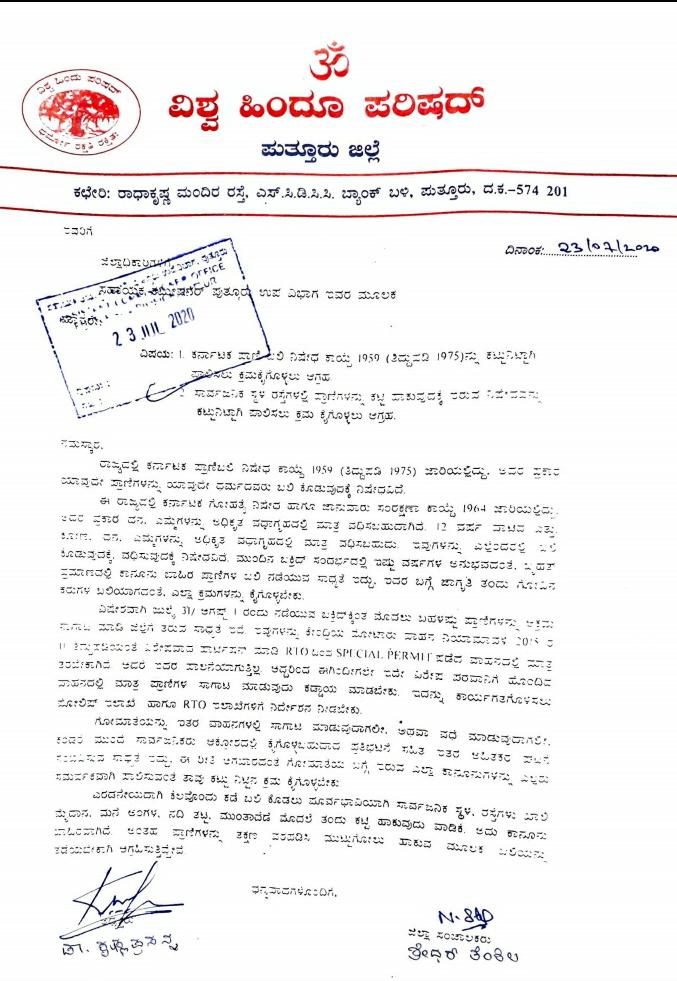ಮುಂದಿನ ಬಕ್ರೀದ್ ಸಂದರ್ಭದಲ್ಲಿ ಇಷ್ಟು ವರ್ಷಗಳ ಅನುಭವದಂತೆ ಬೃಹತ್ ಪ್ರಮಾಣದಲ್ಲಿ ಕಾನೂನು ಬಾಹಿರ ಪ್ರಾಣಿಗಳ ಅಕ್ರಮ ಸಾಗಟ ಹಾಗೂ ಬಲಿ ನಡೆಯುವ ಸಾಧ್ಯತೆ ಇದ್ದು ಇದರ ಬಗ್ಗೆ ಕಠಿಣ ಕಾನೂನು ಕ್ರಮ ಕೈಗೊಳ್ಳಬೆಕೆಂದುದು ಆಗ್ರಹಿಸಿ ಮಾನ್ಯ ಜಿಲ್ಲಾಧಿಕಾರಿಗಳಿಗೆ ಪುತ್ತೂರು ಉಪವಿಭಾಗ ಸಹಾಯಕ ಕಮೀಷನರ್ ಮೂಲಕ ವಿಶ್ವ ಹಿಂದೂ ಪರಿಷತ್ ಬಜರಂಗದಳ ಪುತ್ತೂರು ಜಿಲ್ಲೆಯ ವತಿಯಿಂದ ಮನವಿ ಸಲ್ಲಿಸಲಾಯಿತು.