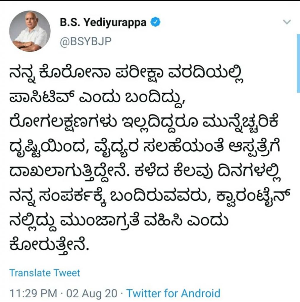 ಕರ್ನಾಟಕ ಸಿಎಂ ಬಿ.ಎಸ್. ಯಡಿಯೂರಪ್ಪನವರಲ್ಲಿ ಕೊರೊನಾ ಸೋಂಕು ದೃಢಪಟ್ಟಿದೆ. ಈ ಬಗ್ಗೆ ತಮ್ಮ ಟ್ವಿಟ್ಟರ್ ಖಾತೆಯಲ್ಲಿ ಅವರು ಬರೆದುಕೊಂಡಿದ್ದಾರೆ.